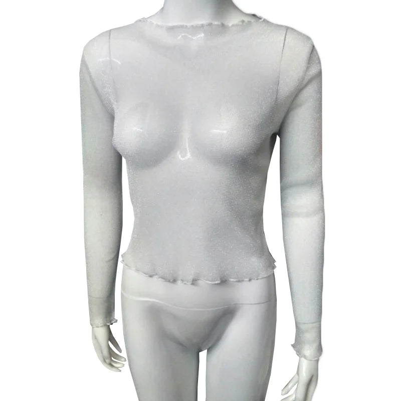 Turn heads this spring with our Sexy Mesh Shiny Long Sleeve T-Shirt. Perfect for club nights or parties, this black transparent top features a sleek O-neck and a thin, breathable mesh fabric that adds a daring, shiny touch to your look. Flirty and fun, it’s the ideal short top to keep you cool while making a bold statement.
